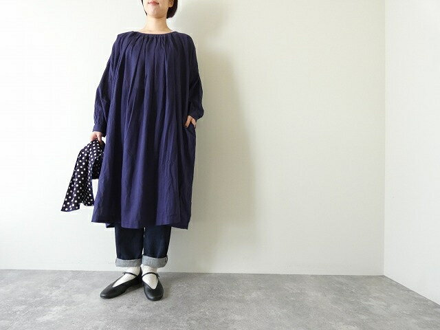 color (2900)ダークパープルsize 2( 身幅 92cm 総丈 106cm 肩幅 70cm 袖丈 41cm) quality 綿 100%モデル身長 162 cm メーカー希望小売価格 \ 20,000+税 メーカー希望小売価格はメーカーカタログに基づいて掲載しています 商品在庫について当店の商品は 実在店舗でも同様に販売をしているため、タイムラグにより店頭で完売してしまった 場合にはご注文を頂いてもご希望の商品を用意できない場合がございますので 予めご了承ください。ご注文をいただきますと、SPACE MOOの自動メールとは別に SPACE MOO からご注文内容と商品在庫の確認メールをお送りしております。 恐れ入りますがSPACE MOOからのメールのご確認の後、 ご入金の お手続きをお願い致します。 *画像と実際の商品のお色はモニターの発色具合や撮影時の天候 等により 多少異なる場合もございます。詳しくはお尋ねください。SOIL 60s COTTON TWILL PLAIN GATHERED SMOCK DRESS 60sコットンツイルプレーンギャザースモックドレス 斜めの織り目(綾目)が特徴のコットンツイル生地は、シワになりにくい上、柔らかな肌触りが魅力です。 落ち感があるためカジュアル過ぎず、大人のデイリーウェアに最適な素材感となっています。 深みのあるダークパープルで秋らしいカラーもポイント。 前後どちらでも着られるデザインのチュニック丈のスモック。 ゆったりとした身幅に襟元から広がるギャザーのドレープ感で、女性らしい柔らかな印象に仕上げられています。 サイドの紐をリボンのように結ぶことで、表情を変えて楽しめます。