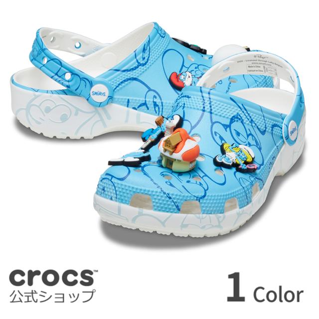 Crocs公式ショップの商品はこちら SALE とびきりキュートなスマーフ クラシック クロッグ。ブルーのアッパー全面にスマーフのプリントをあしらったデザイン。さらに、3Dハット、マッシュルーム、人気キャラクターなどの限定ジビッツ™ チャームが付いたスマーフらしいスタイルが光ります。【商品詳細】・全体にスマーフのプリント ・パパスマーフ、ハンディスマーフ、スマーフェット、3Dスマーフハットなどを含む、スマーフの限定ジビッツ™ チャーム ・別のジビッツ™ チャームを付けてオリジナルの一足にカスタマイズ可能 ・軽量で優れた浮力性と水に強い設計 ・お手入れ簡単で乾きやすい ・フィット感抜群で安心の可動式ヒールストラップ ・アイコニックコンフォート™:軽量。柔軟。包み込むような快適さ。【商品詳細】・驚くほど軽い履き心地・バイオ循環型素材を25%含有した、革新的な「クロスライト」™ 複合材を使用・軽量、水に強い設計で浮遊性・通気性を強化したデザイン・速乾性でお手入れ簡単・可動式ヒールストラップで抜群のフィット感 ・ジビッツ™ チャームでオリジナルの一足にカスタマイズ・アイコニックコンフォート™:軽い。柔らかい。包み込むような快適さ。【仕様/素材】・(甲):合成樹脂、(底):合成樹脂・重さ(参考サイズ):188g(27cm) ・ヒールの高さ:約3cm・リベットが破損した場合のサポートは行っておりません(初期不良を除く)※サイズ選び、実寸の採寸方法はこちら。ワイドサイズはありますか?いいえ、ほとんどのシューズはゆとりのあるサイズなので、一般的なお客様のサイズを選べば快適に履いていただけます。靴の表記サイズが違っているのはなぜですか?ウェブサイトに表示されているサイズはすべて日本のサイズ表記ですが、靴に記載されているサイズはUSサイズです。靴のサイズが合わない場合は?商品の交換は承っておりません。返品の上、再度ご注文をお願いいたします。返品についてはこちらをご確認ください。※ギフトラッピングは承っておりません。※シューズのお手入れについてはこちらをご覧ください。・商品写真はできる限り実物の色に近づけるようにしておりますが、 お使いのモニター設定、お部屋の照明、背景の色等により実際の商品と色味が異なる場合がございます ・メーカー希望小売価格はメーカーサイトに基づいて掲載しています