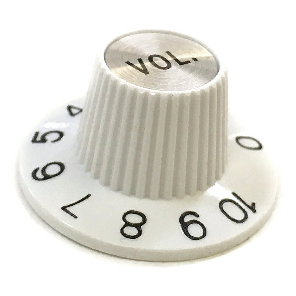 日本製ジャズマスターに使用されていることで有名ながら純正品以外は流通量も少なく希少なホワイトカラーのソンブレロノブ(別名ウィッチハットノブ)。トッププレートはシルバー、文字は"VOL."、CTSなどの24山刻みインチ規格スプリットシャフト用となります。入り数:1個□配送方法に関する注意事項こちらの商品はメール便にてお届けします。また、送料別商品でも税込3,980円以上のご注文で送料無料でお届け致します。(※税込3,980円未満のご注文時の送料についてはこちらをご覧ください。)
