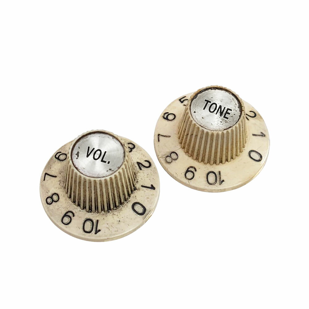 日本製'65年タイプのJazzmasterによりマッチングするようにホワイトカラーのソンブレロノブをエイジングしたYJB PARTSオリジナルのコントロールノブ、"VOL."と"TONE"のセット。トッププレートはシルバー、CTSなどの24山刻みインチ規格スプリットシャフト用となります。※ソリッドシャフトには適合しませんので、ご注意ください。□配送方法に関する注意事項こちらの商品はメール便にてお届けします。また、送料別商品でも税込3,980円以上のご注文で送料無料でお届け致します。(※税込3,980円未満のご注文時の送料についてはこちらをご覧ください。)