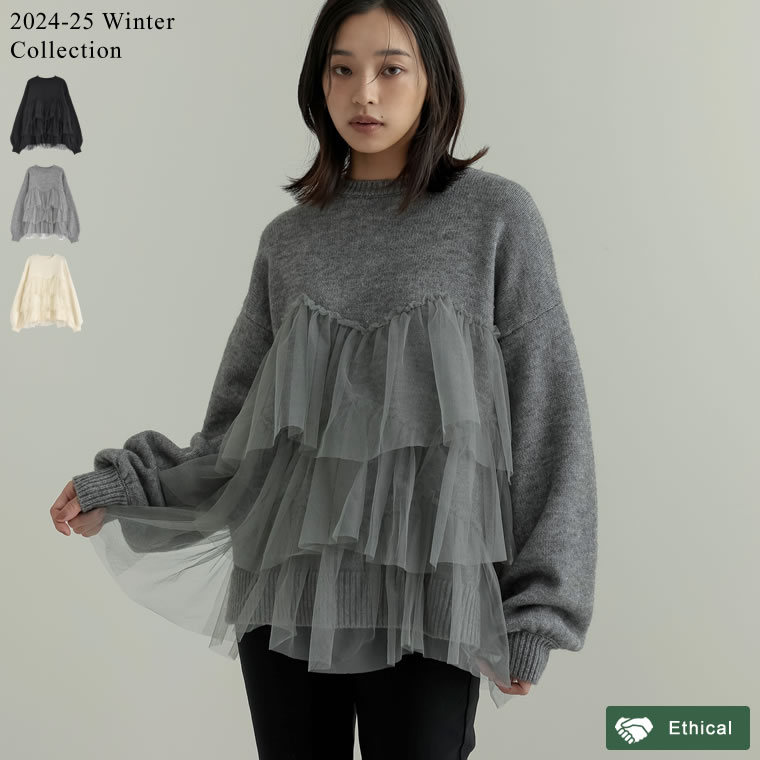 【SPECIAL FAIR】チュールギャザーモヘアタッチニットプルオーバー レディース 秋 冬 リエディ / トップス ニット セーター スウェットライクニット プルオーバー ドッキング フリル オーバーサイズ