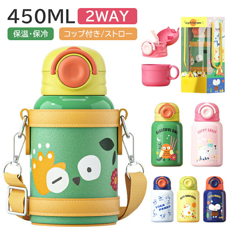 【限定15%クーポン】子供 水筒 魔法瓶 保冷 保温 キッズ ベビー 2way コップ飲み ストロー 450ml 軽量 スポーツ マグボトル ステンレスボトル 子供用 コップ カバー付き 幼児 小学生 幼稚園 保育園 小学校 入学 入園 男の子 女の子 ボトル ワンタッチ 肩紐