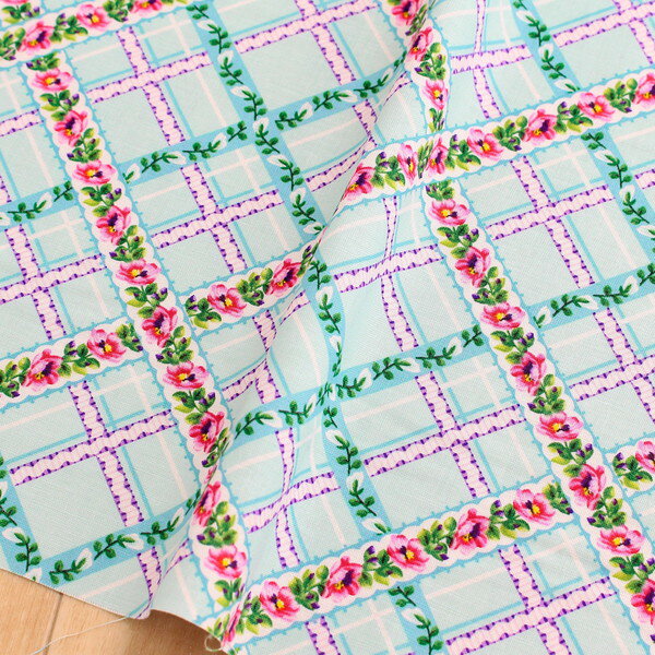 輸入生地 生地 ブルー地 バイアスフラワーチェック Free Sprit フリースピリット USAプリント (最低単位30cm〜10cm単位の切売)