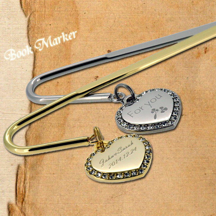 名入れ 本の栞 真鍮 しおり ギフトにお勧め 世界でひとつだけ セレブなストーンハート ゴールド シルバー ブックマーカー プレゼント 金属 名入れ 退職祝 本好き プレゼント しおり