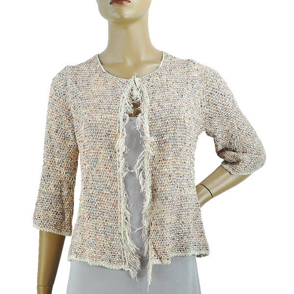 イタリア イントート ブランド SALEPEPESusy Mix ツイード編ジャケット ブラウンブークレ素材でツイード編みをイメージする上品な仕上げのニットジャケット。裾にやや広がる7分袖、フロントのフリンジで更に注目度アップ。コットン混素材、首元のホック1個で留めるタイプ。カラー:ブラウン素材:ポリエステル75%、コットン25%イタリア製マネキンはサイズSMを着用。マネキンのサイズ:周囲86cm肩幅 37cm、ヒップ 89cm、ウエスト 62cm、身長175cm. サイズ 胸囲 肩幅 袖丈 着丈 SM (日本サイズM) 88 ヌード84〜88 35 40 約49 ML (日本サイズL) 92 ヌード88〜92 36 40 約50