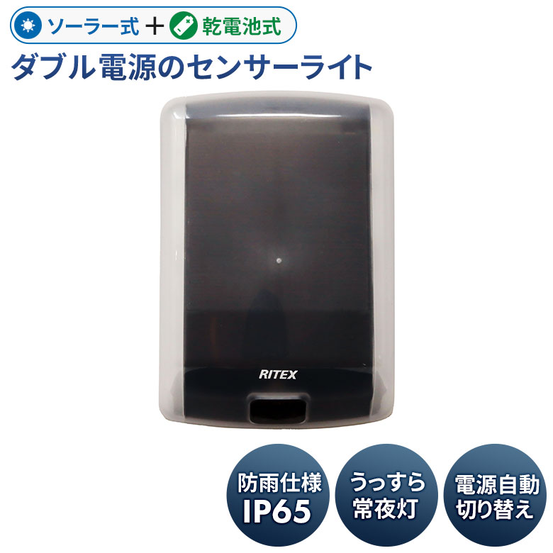 ■ソーラー発電と乾電池のハイブリッド式センサーライトです。■普段はソーラー発電でライトが点灯します。■日照不足によるソーラー発電不足(充電不足)になると自動的に乾電池から電源供給しソーラー式ながら安定した点灯を実現した製品です。■日照時間が短い地域や季節(冬の日本海側など)や点灯回数の多い場所に最適です。■ライトとソーラーパネルが一体型になっていますので配線不要で、玄関・勝手口などに手軽に灯りを設置可能です。■周囲が暗くなるとほのかな灯りで常夜灯になります。(常夜灯機能ON時)■人が近づくと100%の明るさで点灯します。【用途】・門灯・照明に【仕様】・幅(mm): 110・奥行(mm): 42・高さ(mm): 160・光源色: 白色・使用電球(W): 3・明るさ(lm): 250・本体サイズ: W110×D42×H160mm・重量: 約225g(ブラケット含む、 乾電池除く)・電球: 3W 高輝度白色LED(全光束250ルーメン、常夜灯2ルーメン、設計寿命4万時間)・電源: 充電池 リチウムイオン電池 3.7V/1500mAh、乾電池 単3形アルカリ乾電池×3本(別売)・ソーラーパネル: 結晶太陽電池 5V/0.9W・電池寿命(点灯回数): 充電池 春夏秋 平均約90回 / 冬 平均約60回 / 満充電時約630回 ←常夜灯なしのとき、春夏秋 平均約55回 /冬 平均約25回 / 満充電時約580回 ←常夜灯ありのとき ※充電可能な平均日照時間(東京)春夏秋=3時間冬=2時間 太陽の光が当たる南向きにソーラーパネルを向けて取り付けた時の数値です。【材質/仕上】・ライト部レンズ: PC・乳白色レンズ: PC・ライト部&電池蓋&ブラケット: ABS・スイッチ: ABS【セット内容/付属品】・ステンレスバンド(長さ: 1m)×1・ 取り付けネジ×2・コンクリート用プラスチックプラグ×2