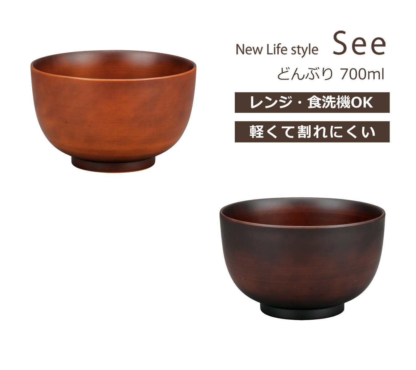 【サイズ】 133×133×81mm 容量700ml【材質】PET, A(PET樹脂とABS樹脂の合成品)【特徴】 食洗機対応、電子レンジ対応、どんぶりやサラダボウルにぴったり、ナチュラルテイストな木目調、軽くて割れにくい丈夫な樹脂製、熱くなりにくく素手でも触れます、収納に便利なスタッキング仕様【原産国】 日本製(石川県加賀市)【メーカー名】 宮本産業株式会社(TEL 0761-78-1818)【商品に関するご注意】ナイフやフォークなどの鋭利な物をご利用頂くと傷が付く可能性もございます。ラッピングは行っておりません。商品欠品時は、お届けにお日にちを頂く場合がございます。その際は、改めてご連絡致します。家庭用の電子レンジ、食洗機に対応の商品は、商品に貼付の取扱説明書に添ってご利用下さい。メーカー受注品の為、商品の仕様や価格等につきましては、予告なく変更される場合があります。また、メーカーにて廃番や完売の時は、誠に勝手ながら、ご注文をキャンセルとさせて頂く事がございます。ご了承下さい。お使いのブラウザやモニターによっては、実際のお色と若干異なる事がございます。メーカー希望小売価格はメーカーカタログに基づいて掲載していますSee シリーズ。Simple(簡単に!)・Every(毎日を!)・Enjoy(楽しむ!)落着きのある色合い、職人が描いた木目調食器。飽きの来ないナチュラルテイストですので、和洋両方にお使い頂けます。私たちは、創造的な「ものづくり」を目指します。宮本産業株式会社は、伝統的な「山中漆器」を育んだ産地にて、日常を豊かにする食器をつくり続けています。伝統的な「漆器」は、とても魅力的です。しかし、使い方や洗い方、手入れの仕方等とても面倒です。そこで、私たちは現代の暮らしに合わせて、電子レンジや食器洗浄機に対応する「漆器」を開発しました。また、デザインにも工夫を凝らし、いまの女性の感性に合う、食器や弁当箱などを開発し好評を得ております。これからも、お客様が求めるニーズに沿って、伝統地場産地の職人さんとともに、新しい「ものづくり」に挑戦して参ります。 【同シリーズの商品】 茶碗 300ml 茶碗 300ml 5個セット お椀 370ml 丼 700ml 丼 700ml 4個セット 丼 1500ml 丸皿 10cm 丸皿 10cm 5枚セット 丸皿 16cm 丸皿 16cm 5枚セット 丸皿 22cm 丸皿 22cm 3枚セット カレー皿 26cm 花皿 14cm 花皿 14cm 5枚セット 花皿 26cm 花皿 26cm 3枚セット 花ボウル 500mL 花ボウル 500mL 5個セット 花スープカップ 360mL 花スープカップ 360mL 3個セット 仕切り皿 21cm 仕切り皿 21cm 2枚セット 仕切り皿 26cm 仕切り皿 26cm 3枚セット ボウル 450mL ボウル 450mL 5個セット ボウル 1100mL ボウル 1100mL 3個セット マグカップ 360mL トレー 36×26cm