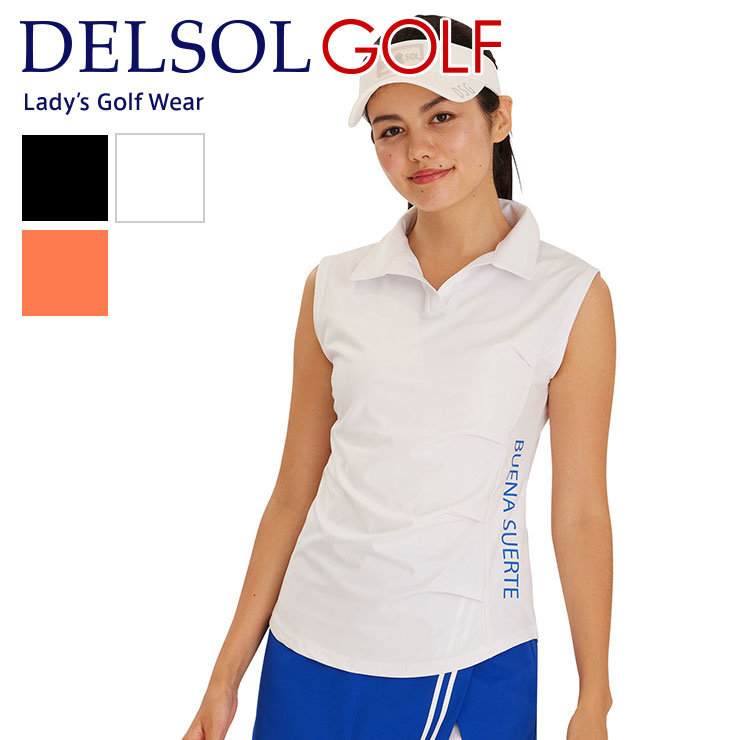 セール品 アウトレット 7771 ギャザー入スキッパーノースリーブシャツ レディース ゴルフウェア デルソル ゴルフ テニス ノースリーブ スキッパー ブラック ホワイト オレンジ 白 黒 S M L LL 3L 大きいサイズ 伸縮性 春夏 夏 シャツ トップス ゆったり 女子 美シルエット