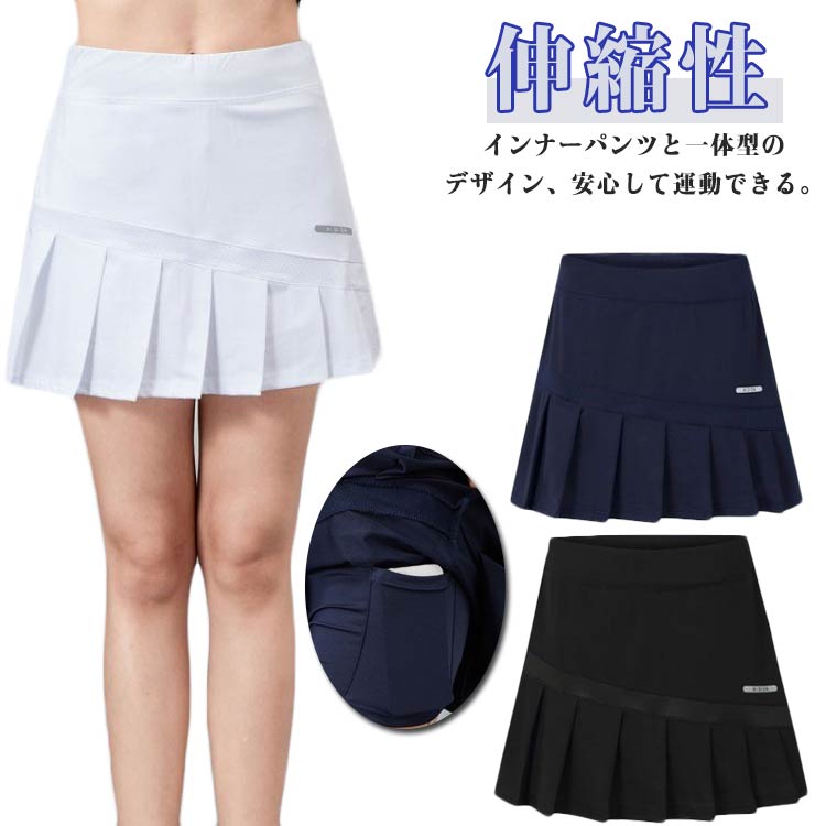 インナーパンツと一体型のデザイン、安心して運動できる。伸縮性・速乾性・通気性に優れたスポーツスカート。肌触り優しい柔らかい生地、よく伸びるから快適な運動を与えます。布地の表面に汗を逃がしてすばやく蒸発させ、さらりと快適な状態をキープします。太ももにポケットが付いていてスマホなど簡単収納ができるので、とても便利です。テニス、ヨガ、スポーツ、ゴルフ、ランニング、フィットネス、ビーチ、バレーボール、アウトドア、ジュアル服、日常着、ルームウェアなど様々なシーン着用感あるのスカート。シンプルなデザインなので10代、20代、30代、40代、50代、60代と幅広い年代で合わせやすく使いやすいアイテムとなります。 サイズ S M L XL 2XL サイズについての説明 【S】おすすめ体重41.5-47.5kg【M】おすすめ体重46.5-52.5kg【L】おすすめ体重51.5-57.5kg【XL】おすすめ体重56.5-62.5kg※サイズは平置き実寸になります。 サイズ表の実寸法は商品によって1-3cm程度の誤差がある場合がございます。 素材 ポリエステル 色 ホワイト ブラック ネイビー 備考 ●サイズ詳細等の測り方はスタッフ間で統一、徹底はしておりますが、実寸は商品によって若干の誤差(1cm〜3cm )がある場合がございますので、予めご了承ください。 ●商品の色は、撮影時の光や、お客様のモニターの色具合などにより、実際の商品と異なる場合がございます。あらかじめ、ご了承ください。 ●製品によっては、生地の特性上、洗濯時に縮む場合がございますので洗濯時はご注意下さいませ。 ▼色味の強い製品によっては他の衣類などに色移りする場合もございますので、速やかに(脱水、乾燥等)するようにお願いいたします。 ▼生地によっては摩擦や汗、雨などで濡れた時は、他の製品に移染する恐れがございますので、着用の際はご注意下さい。 ▼生地の特性上、やや匂いが強く感じられるものもございます。数日のご使用や陰干しなどで気になる匂いはほとんど感じられなくなります。