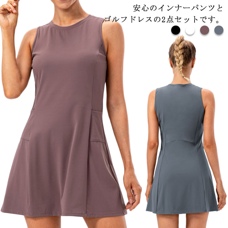 ゴルフウエア GOLF スポーツウェア ワンピース ゴルフドレス レディース クルーネック テニスウェア ゴルフウェア ノースリーブ スポーツウェア 2点セット ぺチパンツ Tシャツ インナーパンツ 夏 ゴルフ用品 通気 送料無料
