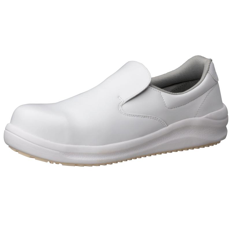 ●滑らないことが、第一の安産である職場に。●靴底パターンを斜めに配置する事で前後だけでなく、横・斜め方向へのグリップ力を強化。●油がついた金属やタイルの床でもしっかりグリップ。グレーチングやタイル等の床が混在する環境でも、新しいハイグリップは幅広い耐滑性能を発揮します。●特殊な配合を施した材料とスリップを起こしにくい靴底意匠と、それを支える補強構造のトリプル効果が地面をしっかり捉えます。●クッション部を短く厚く設計。クッション部で足首にしっかりフィット、通気エリアから靴内のムレを逃します。●靴底に汚れや異物が目詰まりすると、衛生面や耐滑性能の低下を引き起こします。ハイグリップソールは、靴底に汚れが詰まっても取れやすくなっています。●歩く時、かかとから地面に設置する場面で、面で床面を捉える事で、安定性、歩行性を向上させます。●クッション性に優れた素材を使用し足にかかる衝撃を軽減します。●甲板、ソール等の素材、製法にこだわった軽量設計の靴です。●靴底の磨り減りやすい3ヶ所にスリップサインを設けました。●先芯:なし●甲被:人工皮革/合成皮革●中敷:ポリUインソール(抗菌・防臭)●靴底:EVA/合成ゴム●標準重量:600g/足※両足での重さです※標準重量は、26.0cmを基準としています。●サイズ:26.0(EEE)●色:ホワイト足●スリップサイン搭載●注意:つま先保護性能(先芯装備)はありません。●製法:C式●入数:1足●コード番号:2125083411
