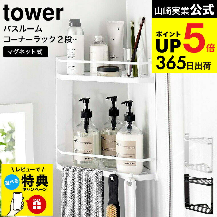 【レビュー特典】[ マグネットバスルームコーナーラック タワー 2段 ] 山崎実業 公式 tower ホワイト/ブラック 6623 6624 / バスラック 棚 バスルーム収納 シャンプー リンス 小物 タオル フック付き 磁石 マグネット 浮かせる収納 デッドスペース 収納 JGS cpj 送料無料