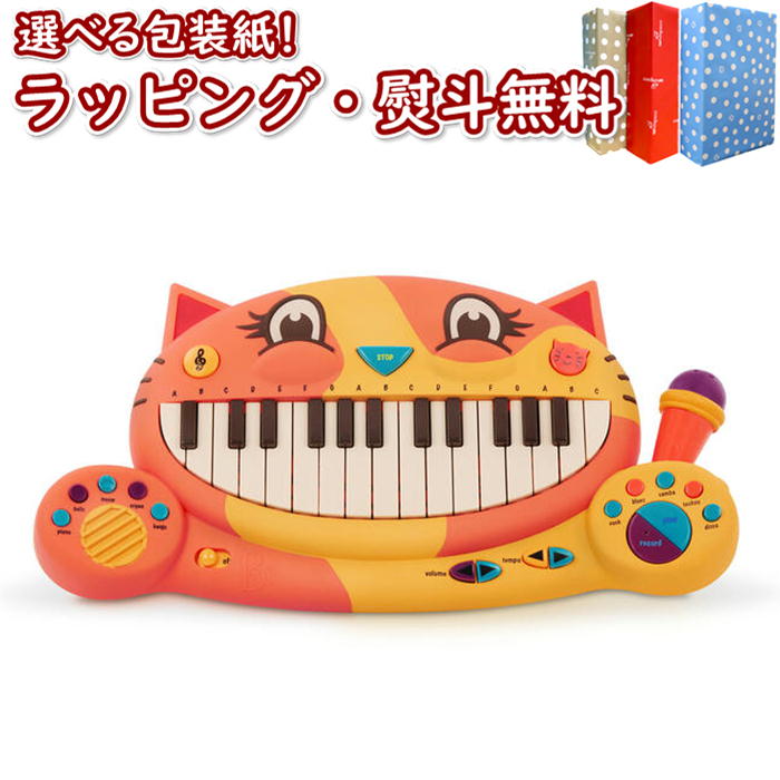 お返し、お祝い、ご挨拶、お中元(御中元)、お歳暮(御歳暮)など、想いがつまった贈り物。 その気持ちを丁寧に熨斗(のし)を掛け、包装し、大切にお届けします。 おしゃれな詰め合わせギフト・贈り物として、内祝いや引っ越し挨拶、引っ越し挨拶ギフト、出産祝い、出産内祝い、内祝い、快気内祝い、結婚祝い、お祝い返し、お礼、退職祝い、退職挨拶をはじめ、子供と楽しめるおもちゃなどお子様・お孫様への誕生日プレゼントにもおすすめです。 ブラックフライデー、クリスマスのご褒美ギフトにも。 「人と人」、「想いと想い」を繋ぎ、紡いでゆく贈りものをいろは堂はご提案いたします。 ** B. toys(ビートイズ)商品はこちら** **知育玩具(おえかき・積み木・楽器など) 商品はこちら** ** おもちゃ特集 商品はこちら ** 商品説明・素材 B. toys のキャットピアノは かわいい猫さんをモチーフにしたおもちゃのキーボードです。 サウンドはピアノ、ベル、オルガン、バンジョー、 ねこの鳴き声の5種類から選択可能。 20曲のメロディーと7つの子ねこの曲をお楽しみいただけます。 歌詞カード同梱。付属のマイクで歌えば、 歌と英語のお勉強にもなるかも? リズムやテンポの調整も可能です。 演奏した曲の録音・再生機能も搭載。 ピアノを弾いてみたい!お子様のはじめての楽器に、 キャットピアノはいかがでしょう? 商品情報 【セット内容】マイクつきキーボード1台、メロディ20曲、こねこの曲×7曲入り 【対象年齢】2歳以上 【本体サイズ】約(長さ)48.26×(幅)6.99×(高さ)25.4cm 【使用電池】 単三電池4本使用(テスト電池付属) 【備考】 ※ご使用の際は、必ず保護者の方が付き添い、危険な使い方をしないように注意してください。 安全のため、破損・変形したおもちゃは使用しないでください。 小さな部品が取れてしまった場合、速やかに処分してください。 ※海外輸入商品により、汚れ・ダメージ等がついている場合がございます。 ※ディスプレイ画面等の環境上、写真と実際の商品の色とは多少違う場合がございます。 ○以上を了承の上ご購入ください○ 広告文責 株式会社いろは堂(TEL:086-241-0168)
