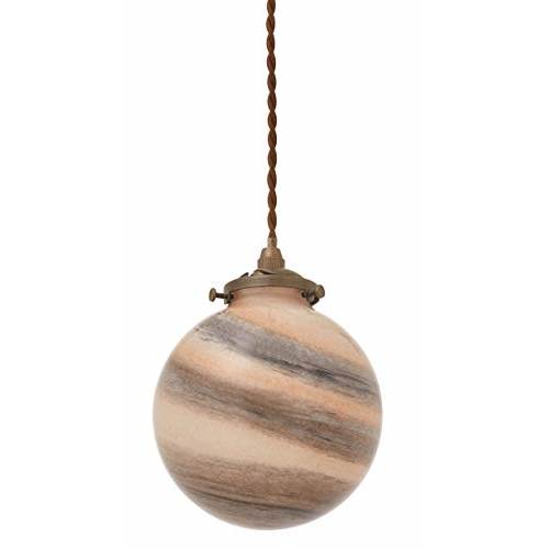 【インターフォルム ユニヴェール ペンダントライト】 ●サイズ:φ150×H180mm 全高44cm〜103mまで調節可能 ●素材:スチール・ガラス ●E17/40W相当 小形LED電球(電球色)×1付 ●重量:0.9kg ●壁スイッチタイプ 点灯→消灯 ●明るさの目安:3~4.5畳 ●北海道、沖縄、離島への配送は荷物中継料が別途かかります。 ※製造工程上ガラスの模様には個体差があります。 宇宙に浮かぶ惑星をモチーフにしたペンダントライト。消灯時にはアーティスティックなインテリアアイテムとしてお部屋を彩り、点灯するとマーブル模様を浮かび上がらせながら幻想的な光が広がります。表面に塗料を塗布したガラスを丁寧に吹いて仕上げることで、美しいマーブル模様を作り出しています。惑星を取り囲む大気や雲を思わせるデザインはハンドメイドで作られており、同じカラーでも模様や色の出方に個体差があるのも魅力。アンティークゴールドのソケットとブラウンの縒りコードを採用することで、レトロモダンな雰囲気を強調しました。ガラスセードはONとOFFで見せる表情が大きく違うのが特徴で、グレーとブラウンは消灯時にははっきりとわかる色の差ですが、点灯させると色の違いがあいまいになることで、マーブル模様が和らぎ、色違いで並べて吊っても統一感が感じられます。コンパクトなサイズ感なのでキッチンやダイニングに複数吊るせば、表情豊かな空間を演出できます。書斎や応接間など格式のある演出や子供部屋の世界観づくりまで、幅広いコーディネイトでお楽しみいただけます。 この製品は以下のバリエーションもお選びいただけます。 クリアミニクリプトン球付タイプ 電球なしタイプ LED電球などお好みの電球を取付できます。