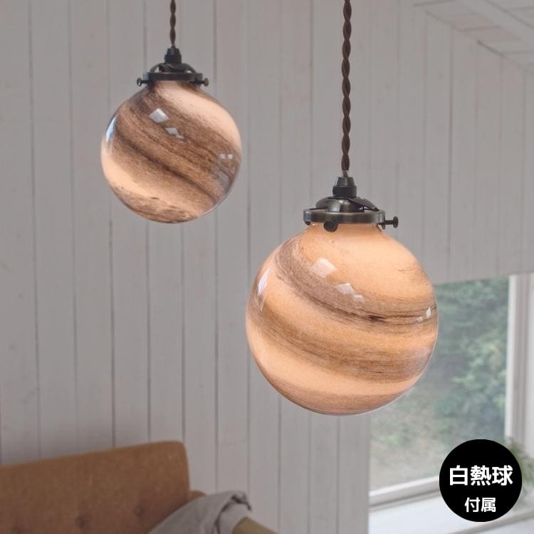商品情報 宇宙に浮かぶ惑星をモチーフにしたユニークなペンダントライト。 消灯時にはアーティスティックなインテリアアイテムとしてお部屋を彩り、点灯するとマーブル模様を浮かび上がらせながら柔らかな光を広げます。 商品詳細 サイズ φ150×高さ180(mm) コード調節:全高440-1030(mm) 重量 900(g) カラー グレー、ブラウン 材質 スチール、ガラス 付属品 E17/60W クリアミニクリプトン球×1 仕様 取付方法:引掛けシーリング式 壁スイッチ(点灯→消灯) 口金サイズ/E17 60W×1まで対応(クリアミニクリプトン球付) ※別途電球をご使用の際は電球サイズ/外径37(mm)以下のものをお選びください。 依りコード 仕様 スイッチ/なし(壁スイッチON/OFF) 備考 製造工程上、ガラスの模様には個体差があります 注意事項 商品のデザイン・仕様は改善のため、入荷のタイミングにより予告なく変更する場合がございます。ご了承ください。 実物に近い色を画像で表現していますが、撮影環境、お使いのディスプレイなどの条件によって多少の誤差が生じる場合がございます。 ご注文タイミングやご注文内容によっては、購入履歴からのキャンセル、修正を受け付けることができない場合がございます。