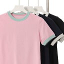 Tシャツ レディース 半袖 ラウンドネック 配色 切り替え 綿 ポリエステル混紡 スリムフィット トップス 通勤着 普段使い きれいめ かわいい