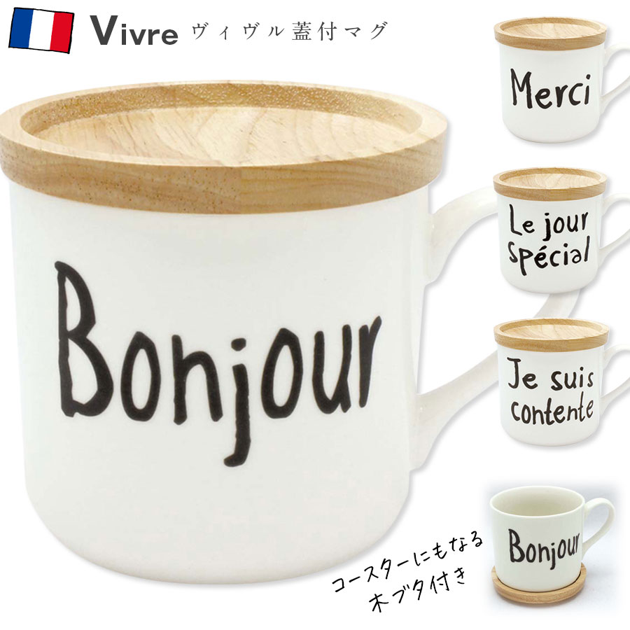 【ヴィヴル蓋付マグ】 くつろぎ時間の、フレンチなごあいさつ。 お気に入りのコーヒーとスイーツを用意して、とっておきの時間を。 ボンジュール!メルシー! 陽気なあいさつが飛び交うパリの街角のような、おしゃれなカフェタイムをどうぞ。 ※性質上、釉薬表面の細かなヒビ(貫入)や表面の凹凸、小さな穴がある場合がございます。 また釉薬の発色、サイズや形状、柄などに個体差が出ますので、陶器の風合いとしてお楽しみください。 ─┘─┘─┘─┘─┘─┘─┘─┘─┘─┘ 【商品詳細】 ■幅95mm×H90mm、容量370ml(満水) ■本体:ニューボン、蓋:天然木 ■特長 電子レンジ対応:○ 食洗機対応:○ 直火・オーブン対応:× ■マグ:日本製、木蓋:中国製 ※在庫について この商品は当店別店舗でも販売しております。 在庫数の更新は随時行っておりますが、状況によっては商品が品切れとなることもございます。また商品取り寄せによりお届けまでにお時間をいただく場合もございます。 お客様には必ず連絡をいたしますが、万が一メーカーで品切れ等の理由により入荷予定がない、もしくは入荷が遅れる場合はキャンセルさせていただく場合もございますことをあらかじめご了承ください。 ─┘─┘─┘─┘─┘─┘─┘─┘─┘─┘