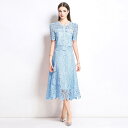 ワンピース レディース レース ブルー ピンク系 杏色 小柄 痩せ見え 気質 通勤 超長袖 膝丈 ポリエステル セットアップ