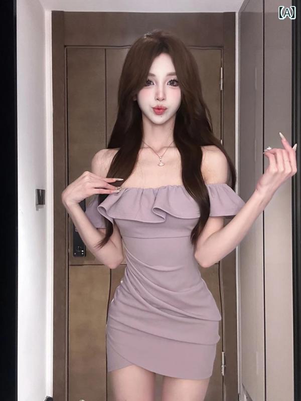 フリル ショート ドレス 白の フリル ワンショルダー ドレス レディース 夏 2024 スリムフィット プリーツ ヒップ スカート