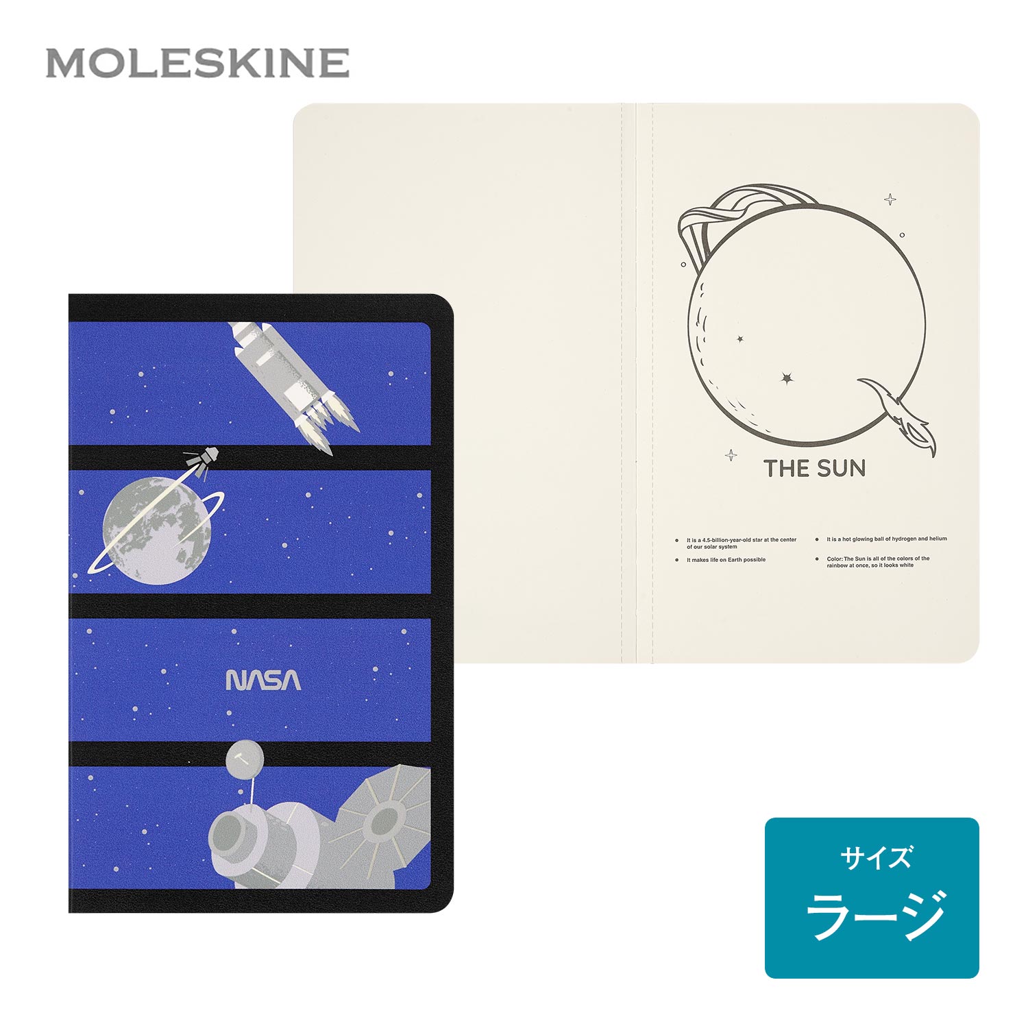 好奇心、発見、そして宇宙をめぐる壮大で感動的な旅を称えるコレクションへようこそ。 NASAにインスパイアされたこの限定版は、あらゆる革新を生み出す原動力である“パイオニア精神”に敬意を表しています。 どんなに大胆なミッションも、1ページに書き留められた小さなアイデアから始まる そのことを私たちに思い出させてくれます。 ペンを手に取り、紙に書くことこそが、人間の持つ無限の可能性を切り拓く最良の方法なのです。 日々のタスクに取り組むときも、大きな夢に向かって挑戦するときも NASAに着想を得たこの限定版ヴォラントジャーナルは、あなたの創造の流れを描くためのツールとなります。 カバーは暗闇で光る仕様で、アイデアに光を当てるような特別な体験を演出します。 書くたびに、人間の想像力という無限の宇宙に触れることができるのです。 このヴォラントジャーナルは、あなた自身の創造力の無限の広がりを探求するための空間。 ペンを走らせるたびに、新たなインスピレーションが生まれます。 思索する人、試作する人、夢見る人、そして探究を続けるすべての人たち 過去、現在、未来のビジョナリーたちに捧げる一冊です。 【商品詳細】 カテゴリー ノートブック/限定版ノートブック 商品名 モレスキン ノート NASA-inspired ヴォラン ジャーナル ラージサイズ (横13cm×縦21cm) SKVLNTL7063S5 カラー ブルー カバー NASA-inspired デザインのソフトカバー暗闇で光るヴォランジャーナル サイズ ラージサイズ(横13cm×縦21cm): モレスキンの手帳やノートブックのサイズは既存のサイズ(A4、B5など)とは異なります。 モレスキンの手帳やノートブックは黄金比と呼ばれる縦横の独自の比率により、見た目の美しさや日常での使いやすさを追求したサイズになっています。 詳細 NASAにインスパイアされた、人類の好奇心と探求の精神を讃えるコレクションです。 柔らかなカバーとステッチ入りの装丁で、軽量かつ丈夫な仕上がりです。 毎日のタスクから大きな挑戦まで、創造の流れを記録しサポートしてくれます。 ペンを走らせるたびに、想像力という無限の宇宙に触れる体験が広がります。 考える人、夢見る人、挑戦する人、探究を続けるすべてのビジョナリーに贈りたい一冊です。 - 丸みをつけた角 - アイボリー、100 g/m²、中性紙、無地 - 切り取ってシェアできます:全ページが切り離し式 - 表紙見返しに「In case of loss」の記載 - モレスキン製品の紙は、適切に管理され FSC™ 認証を受けた森林、ならびにその他の管理下に置かれたソースから調達された原料を使用しています。 キーワード ノート メモ メモ帳 文房具 文具 雑記帳 おしゃれ シンプル ビジネス 勉強 仕事 ブランド 日記 NASA ヴォラン ジャーナル 宇宙 かわいい ラージサイズ 限定版 ギフト プレゼント お祝い【NASA-inspired コレクション】 NASA-inspired ヴォラン ジャーナル ラージサイズ NASA-inspired カイエ ジャーナル ラージサイズ 2冊セット