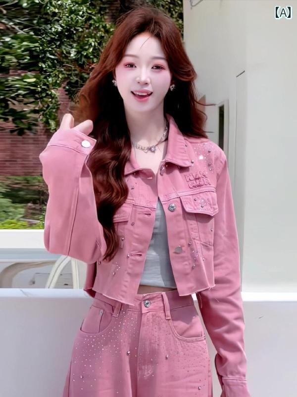 レディース カジュアル ウェア 女性用 ピンク デニムスーツ 春秋 年齢を 減らす 衣装 高級 ショート ジャケットと ワイド レッグ パンツの 完全な セット ツーピース スーツ