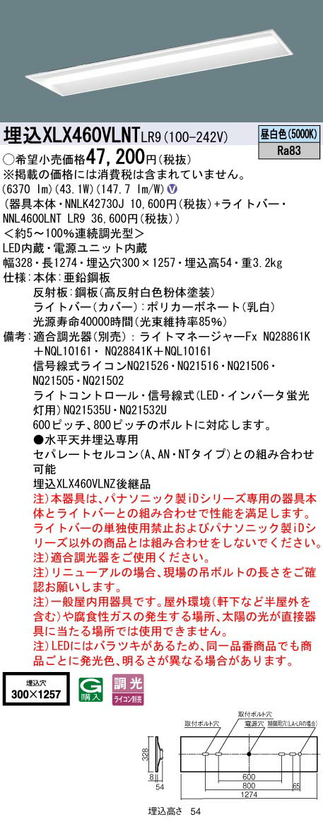 天井埋込型 40形 一体型LEDベースライト 連続調光型調光タイプ(ライコン別売) コンフォート/下面開放型 Hf蛍光灯32形高出力型2灯器具相当 Hf32形高出力型・6900 lm 【器具本体】NNLK42730J 【ライトバー】NNL4600LNT LR9 LED内蔵、電源ユニット内蔵 光源 ◆LED(昼白色) ◆色温度:5000 K ◆光源寿命40000時間(光束維持率85%) 寸法・質量 ◆幅:328 mm ◆長:1274 mm ◆埋込穴幅:300 mm ◆埋込穴長:1257 mm ◆埋込高:54 mm ◆質量:3.2 kg 仕様・注意事項 ◆器具光束:6370 lm ◆安定器出力型:定格出力型 ◆安定器補足:<約5〜100%連続調光型> ◆電圧:100〜242 V ◆消費電力:43.1 W ◆消費効率:147.7 lm/W ◆【本体】亜鉛鋼板 ◆【反射板】鋼板(高反射白色粉体塗装) ◆【ライトバー(カバー)】ポリカーボネート(乳白) ◆天井埋込型 ◆Ra83 ◆600ピッチ、800ピッチのボルトに対応します。 ◆●水平天井埋込専用 ◆セパレートセルコン(A、AN・NTタイプ)との組み合わせ可能 ◆注)一般屋内用器具です。屋外環境(軒下など半屋外を含む)や腐食性ガスの発生する場所、太陽の光が直接器具に当たる場所では使用できません。