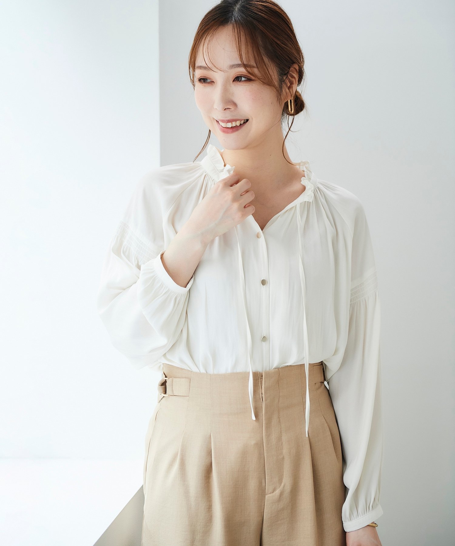 le.coeur blanc(ルクールブラン)カッセンジョーゼット2wayフリルネックブラウス【前後2way、羽織のインにも映えるブラウス】繊細なジョーゼット素材で、簡単にニュアンスのあるスタイルが決まります。ゴールドボタンを前にすると華やかな印象で、1枚で着映えするデザイン。ボタンを後にするとシンプルな印象になり、ジャケットやカーディガンのインにもオススメです。衿元はフリルとリボンをあしらったデザインで、顔まわりも華やかに。リボンを結ぶとクラシックな雰囲気に、結ばずに垂らすとラフな印象で着ていただけます。袖にはシャーリングをあしらい、春らしいふんわりと軽やかなシルエットに仕上げました。【スタッフ着用コメント】<スタッフA>30代後半/161cm/骨格ウェーブ/普段サイズ36-38/着用サイズ38サイズ感:身体のラインを拾わないサイズ感です。素材感:落ち感のあるとろみ素材です。着用感:サラッとした着心地なので、気温が上がるこれからの時期にも大活躍します。<スタッフB>20代後半/154cm/骨格ストレート/普段サイズ36/着用サイズ38サイズ感:少しゆとりがある。丈は程よくお尻が隠れる長さ。素材感:サラッとしていて肌触りが良い。着用感:前後2wayなので着回しの幅が広がりそう。ドットも小さめで大人っぽく着れます。*摩擦や水濡れによる色落ち・色移りにご注意下さい。型番:303303-5903-02-38 GW9374【採寸】38/バスト120cm/着丈59cm/裄丈72.5cm/袖口10cm商品のサイズについて【商品詳細】中国製素材:ポリエステル100%サイズ:38洗い可 ドライクリーニング可 陰干し※画面上と実物では多少色具合が異なって見える場合もございます。ご了承ください。商品のカラーについて 【予約商品について】 ※「先行予約販売中」「予約販売中」をご注文の際は予約商品についてをご確認ください。■重要なお知らせ※ 当店では、ギフト配送サービス及びラッピングサービスを行っておりません。ラッピング・ギフト配送について同時に複数の商品を注文された場合メーカー希望小売価格についてご利用ガイドle.coeur blanc(ルクールブラン)カッセンジョーゼット2wayフリルネックブラウス【前後2way、羽織のインにも映えるブラウス】繊細なジョーゼット素材で、簡単にニュアンスのあるスタイルが決まります。ゴールドボタンを前にすると華やかな印象で、1枚で着映えするデザイン。ボタンを後にするとシンプルな印象になり、ジャケットやカーディガンのインにもオススメです。衿元はフリルとリボンをあしらったデザインで、顔まわりも華やかに。リボンを結ぶとクラシックな雰囲気に、結ばずに垂らすとラフな印象で着ていただけます。袖にはシャーリングをあしらい、春らしいふんわりと軽やかなシルエットに仕上げました。【スタッフ着用コメント】<スタッフA>30代後半/161cm/骨格ウェーブ/普段サイズ36-38/着用サイズ38サイズ感:身体のラインを拾わないサイズ感です。素材感:落ち感のあるとろみ素材です。着用感:サラッとした着心地なので、気温が上がるこれからの時期にも大活躍します。<スタッフB>20代後半/154cm/骨格ストレート/普段サイズ36/着用サイズ38サイズ感:少しゆとりがある。丈は程よくお尻が隠れる長さ。素材感:サラッとしていて肌触りが良い。着用感:前後2wayなので着回しの幅が広がりそう。ドットも小さめで大人っぽく着れます。*摩擦や水濡れによる色落ち・色移りにご注意下さい。型番:303303-5903-02-38 GW9374【採寸】38/バスト120cm/着丈59cm/裄丈72.5cm/袖口10cm商品のサイズについて【商品詳細】中国製素材:ポリエステル100%サイズ:38洗い可 ドライクリーニング可 陰干し※画面上と実物では多少色具合が異なって見える場合もございます。ご了承ください。商品のカラーについて