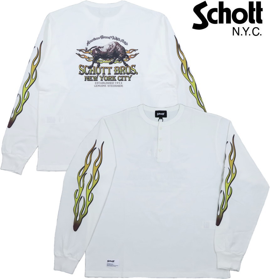 Schott/ショット FIRE PATTERN HENLEY L/S T-SHIRT ファイヤーブル プリント入り、ヘンリーネックTシャツ/カットソー WHITE(ホワイト)