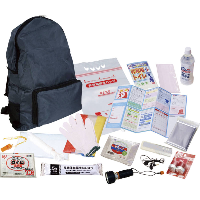 セット内容非常用持ち出し袋 非常用アルミシート ホイッスル(ひも付き) 携帯簡易トイレ(2) エイドチーム 非常用食器折り紙 軍手 不織布マスク(3) 非常用給水袋5L LED懐中電灯 単1乾電池(2本組) 持ち運び簡単エアー枕 立体スポンジアイマスク 耳栓(1組) 歯ブラシ 歯磨き粉 コップ(2色アソート) 不織布スリッパ(1組) ロープ(3m) 防災用ウェットティッシュ ※セット部材に一部変更が生じる場合がございます。