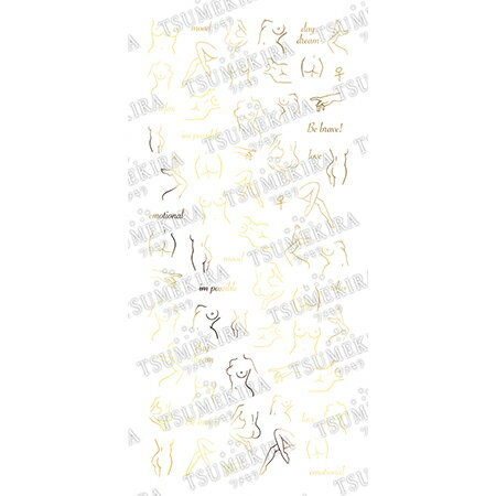 【品番・カラー】SG−DAI−115美しく神秘的な女性の身体のデザインを、金箔を施したようなgoldの線画でステッカーにしました。エロスではなく、アートとしてファッションのポイントでネイルにつけてみては如何でしょうか、GOLDで縁取られた身体のラインがキラリとした輝きは、まるで幻想的なオブジェのようです。【内容量・備考】150mm×88mm