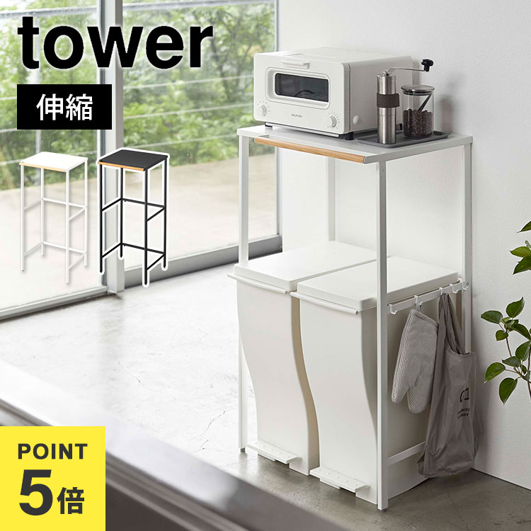 伸縮ゴミ箱上ラック ゴミ箱ラック タワー tower 山崎実業 キッチン ラック 棚 キッチンカウンター 作業スペース ゴミ箱上収納 伸縮式 可動式 スリム 収納ラック おしゃれ シンプル 無地 白 黒 ホワイト ブラック 北欧 キッチン家電ラック 隙間収納 ハンガーバー 5326