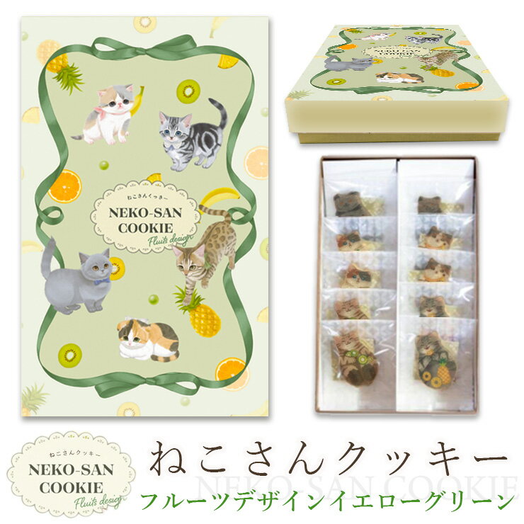 【ねこさんのポストカードつき】猫 お菓子 クッキー ねこさんクッキー ( 10枚入 ) 個包装 フルーツパッケージVer イエローグリーン 猫 ねこ ネコ キャット 三毛猫 ハチワレ 茶縞 黒縞 クロネコ かわいい クッキー お菓子 焼き菓子 詰め合わせ グッズ ギフト 2025