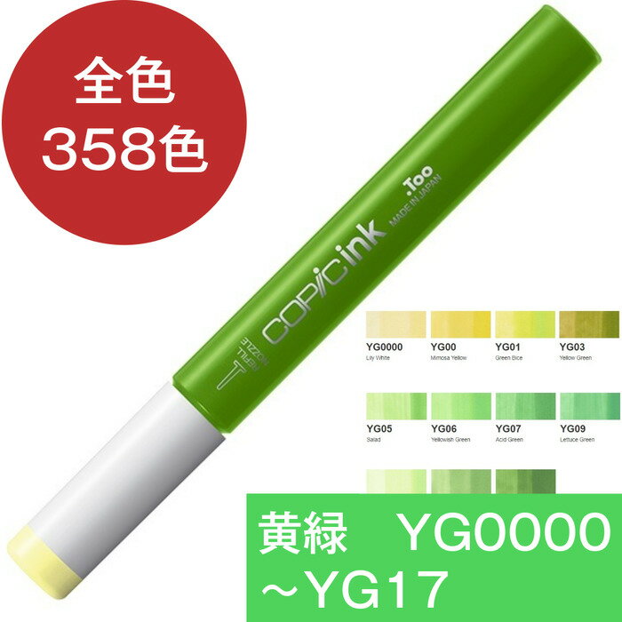 コピックインク YG イエローグリーン 黄緑 コピック 補充 インク COPIC 黄緑系 Yellow Green YG0000 YG00 YG01 YG03 YG05 YG06 YG07 YG09 YG11 YG13 YG17 コピック 補充液 インクアート アルコールインク 12ml スケッチ チャオ クラシック ワイド