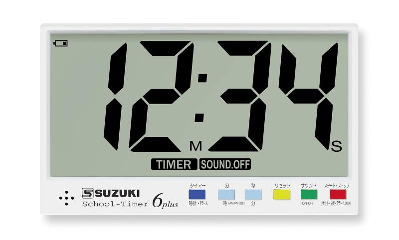 スズキ(Suzuki) SUZUKIスクールタイマー6plus STEX-06P超大画面タイマーSTEX-04Pがリニューアル 従来の機能はそのままに、新たに「電池交換お知らせマーク」機能をプラスしました。電池残量が少なくなると、マークが現れ点滅します。電池交換の必要なタイミングがわかり、突然の電池切れを防ぎます。「タイマー」「ストップウォッチ」「アラーム」「時計」の機能は変わらず、操作もシンプルで簡単「テスト時間」や「理科の実験」、また「体育」や「部活動」といった様々な場面で活躍します。背面マグネットにより黒板に貼ってのご使用の他、卓上や壁掛けにも対応しています。