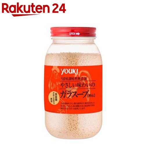 お店TOP>フード>調味料・油>中華調味料>中華だし>ユウキ食品 やさしい味わいのガラスープ (400g)【ユウキ食品 やさしい味わいのガラスープの商品詳細】●スープにも炒め物にも使いやすい顆粒タイプ。●素材の味を邪魔せずに旨みとコクをプラスします。●野菜炒め、炒飯、焼きビーフン、スープなど幅広くお使いいただけます。【召し上がり方】1人分の使用量目安・スープ:水200ml:本品小さじ2・チャーハン:ご飯200g:本品小さじ1-2※小さじ1=約2.5g【品名・名称】ガラスープの素【ユウキ食品 やさしい味わいのガラスープの原材料】食塩(国内製造)、チキンエキスパウダー、コーンスターチ、砂糖、酵母エキスパウダー、ポークエキスパウダー、野菜エキスパウダー、香辛料/加工デンプン、(一部に鶏肉・豚肉を含む)【栄養成分】小さじ1(2.5g)当たりエネルギー:6kcal、たんぱく質:0.1g、脂質:0.04g、炭水化物:1.3g、食塩相当量:1.0gサンプル品分析による推定値【アレルギー物質】鶏肉、豚肉【保存方法】直射日光・高温多湿をさけて保存してください。【ブランド】ユウキ食品(youki)【発売元、製造元、輸入元又は販売元】ユウキ食品リニューアルに伴い、パッケージ・内容等予告なく変更する場合がございます。予めご了承ください。ユウキ食品182-0033 東京都調布市富士見町1-2-20120-69-5321広告文責:楽天グループ株式会社電話:050-5577-5043[調味料/ブランド:ユウキ食品(youki)/]