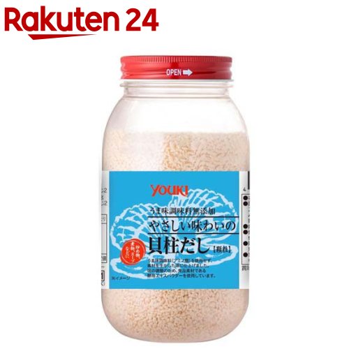 お店TOP>フード>調味料・油>中華調味料>中華だし>ユウキ食品 やさしい味わいの貝柱だし (400g)【ユウキ食品 やさしい味わいの貝柱だしの商品詳細】●滋味豊かな干し貝柱の旨みが広がり、素材の味が引き立つやさしい味わいの顆粒だしです。●スープベース…水200ml : 本品小さじ2。●中華粥…ご飯200g 水200ml : 本品小さじ2。(※小さじ1は約2.5g)【品名・名称】貝柱だし(調味料)【ユウキ食品 やさしい味わいの貝柱だしの原材料】食塩(国内製造)、ほたてエキスパウダー、砂糖、煮干貝柱、酵母エキスパウダー、粉末醤油/加工デンプン、(一部に小麦・大豆を含む)【栄養成分】小さじ1(2.5g)あたりエネルギー:6kcal、たんぱく質:0.2g、脂質:0g、炭水化物:1.4g、食塩相当量:0.8g【アレルギー物質】小麦、大豆【保存方法】直射日光・高温多湿をさけて保存してください。【注意事項】開封後は密閉して保存し、なるべく早めにご使用ください。【原産国】日本【発売元、製造元、輸入元又は販売元】ユウキ食品リニューアルに伴い、パッケージ・内容等予告なく変更する場合がございます。予めご了承ください。ユウキ食品182-0033 東京都調布市富士見町1-2-20120-69-5321広告文責:楽天グループ株式会社電話:050-5577-5043[調味料]