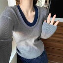 ニット レディース 秋冬 Vネック 長袖 プルオーバー 配色 切り替え あったか アンディベルベット風 インナー トップス 韓国 普段使い デート ブラック ホワイト ブルー グレー レッド