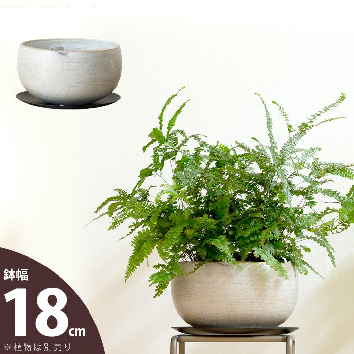 計算された美しいデザイン。高級感ある浅鉢。 浅い鉢は素敵だけど「浅すぎて、植物を植えるのが困難」なデザインの鉢が多いです。 対しこちらの鉢は、植物をよく触ってる人がデザインした鉢。サイズ感が絶妙、goodです! 3号苗の寄せ植えに。ボリュームがある3号苗なら2つ、最初から盛りっとさせたいなら3ポット寄せ植えしてください。ポトス、アイビーなどツル性植物が似合うと思いますが、ソフォラみたいな背の高い植物を植えても面白いと思います! サイズ目安 (1) 鉢の直径:18cm(内寸17cm) (2) 鉢高さ:10.5cm ※排水穴あり、受皿(直径19.5cm)付き。 鉢の素材は陶器、受皿はアイアンとなります。 関連商品 ■■イメージ写真の置き台 ■■土でお勧めはプレミアム用土 注意事項 鉢や受皿には小さな傷、カケ、歪みがございます。 また表面の模様も、一定ではありません。色味も若干の個体差があります。 園芸の植木鉢では、どうしてもこういったことがあります。鉢はこういうものと、ご理解ください。 素材 陶器 配送料 こちらは「通常送料」商品です。 送料はコチラ 備考 【同梱おすすめ】