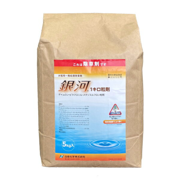 問題雑草に強い除草成分「アルテア」配合。SU抵抗性雑草もしっかり枯らします! ・クログワイやホタルイなど、多年生雑草もしっかり枯殺! ・塊茎形成を抑制、翌年の発生要因を減らすことが可能! ・オモダカ、コナギなどSU抵抗性雑草への効果を強化! SU抵抗性雑草の防除に定評のある成分「ピラクロニル」をプラス ・田植同時散布、無人ヘリ散布も可能! ・直播水稲にも使える! 商品情報 製品名 銀河1キロ粒剤 分類 除草剤 有効成分 ダイムロン10.0% ピラクロニル2.0% メタゾスルフロン1.0% 毒性 普通物 内容量 5kg メーカー 日産化学株式会社 注意 ご使用の前に製品のラベルをよくお読みいただき、適切な方法でご使用ください。 リニューアルに伴い、パッケージ・内容等予告なく変更する場合がございます。予めご了承ください。 関連製品 銀河1キロ粒剤 1kg 銀河1キロ粒剤 5kg 銀河フロアブル 500ml 銀河ジャンボ 作物名 適用雑草 使用時期 使用量 使用方法 総使用回数 移植水稲 水田一年生雑草及びマツバイホタルイウリカワミズガヤツリヘラオモダカヒルムシロセリオモダカクログワイコウキヤガラシズイ 移植時 1kg/10a 田植同時散布機で施用 本剤:1回ダイムロン剤:3回以内(育苗箱散布は1回以内、本田では2回以内)ピラクロニル剤:2回以内メタゾスルフロン剤:2回以内 移植直後〜ノビエ3葉期ただし、移植後60日まで 湛水散布又は無人航空機による散布 直播水稲 水田一年生雑草及びマツバイホタルイウリカワミズガヤツリヘラオモダカヒルムシロ 稲2葉期〜ノビエ3葉期ただし、収穫60日前まで 多年生雑草・藻類に対する散布適期 雑草名 ※銀河1キロ粒剤 ※銀河フロアブル ※銀河ジャンボ ノビエ 3葉期まで 3葉期まで 3葉期まで ホタルイ 3葉期まで 3葉期まで 3葉期まで ウリカワ 2葉期まで ミズガヤツリ 3葉期まで ヘラオモダカ 2葉期まで 2葉期まで 2葉期まで ヒルムシロ 発生期まで 発生期まで 発生期まで セリ 再生始期まで 再生始期まで 再生始期まで オモダカ 矢尻葉3葉期まで 発生始期まで 矢尻葉3葉期まで クログワイ 草丈30cmまで 草丈30cmまで コウキヤガラ シズイ 草丈20cmまで 草丈3cmまで 草丈20cmまで アオミドロ・藻類による表層はく離 - - 発生前