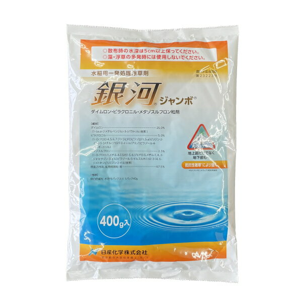 問題雑草を抑える新規有効成分メタゾスルフロン(アルテア)を配合!! イネヒーロージャンボの特長 ●問題雑草を抑える新規有効成分メタゾスルフロン(アルテア)を配合しています。 ●移植後5日〜ノビエ3葉期まで使用可能です。 ●ホタルイ、コナギ、アゼナなどSU抵抗性雑草にも高い効果があります。 ●有効成分がノビエを含む一年生雑草へ安定した効果と優れた残効性を発揮します。 商品名 イネヒーロージャンボ 分類 水稲除草剤 有効成分 ペントキサゾン・・・7.5% ダイムロン・・・25.0%メタゾスルフロン・・・2.5% 毒性 普通物 内容量 400g ※製品のラベルをよくお読みいただいて、適切な方法でご使用ください。 ■適用作物名・雑草名■ 移植水稲: 水田一年生雑草, マツバイ, ホタルイ, ウリカワ, ミズガヤツリ, クログワイ, オモダカ(北陸・近畿・中国・四国), ヘラオモダカ(東北), ヒルムシロ, セリ, アオミドロ・藻類による表層剥離 ◇上手な使い方◇ ▼雑草の発生前から生育初期に有効なので、ノビエの3葉期までに時期を失しないように 散布してください。 ▼なお、多年生雑草は生育段階によって効果にフレが出るので、必ず適期に散布するように 注意してください。各雑草の散布適期は以下のとおりです。 ●ホタルイ……………………………………3葉期(北陸、九州は2葉期)まで ●ヘラオモダカ………………………………3葉期まで ●ミズガヤツリ………………………………3葉期(北陸は2葉期)まで ●ウリカワ……………………………………2葉期(東北は発生始期、関東・東山・東海は3葉期)まで ●ヒルムシロ…………………………………発生期まで ●セリ…………………………………………再生前〜再生始期まで ●クログワイ、オモダカ……………………発生前〜発生式始期まで ●アオミドロ・藻類による表層剥離………再生前まで ▼クログワイ、オモダカは発生期間が長く、生育段階によって効果にフレが出るので有効な 後処理剤との組合わせで使用すること。また、クログワイ(東北、関東・東山・東海)は 有効な後処理剤との組み合わせで連年施用することによりさらに効果が向上します。 ▼初期剤との体系散布では、移植後10日〜15日頃、 一発処理の一回散布では、移植後5日〜10日頃が施用の目安です。 製品のラベルには適用病害虫の範囲及び使用方法、効果・薬害・安全上の注意などが記載されております。 ご使用前によくお読みいただいて、適切な方法でご使用ください。 パッケージは予告無しに変更になる場合がございます。