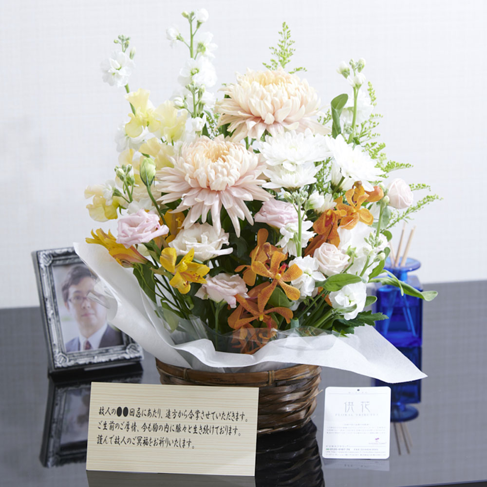 【送料無料】<ご自宅専用>供花アレンジメント 洋風仕立て(イエロー&ピンク系) 商品について ご葬儀後の自宅飾りや年忌法要、女性の故人へ贈るシーンを想定した洋風供花アレンジメント ■□■ 重要なご注意 ■□■ この商品は仏壇やお墓へのお供えを想定した商品の為、斎場やお寺などで行われるお通夜や告別式へお届けする商品ではございません。お通夜や告別式などの葬儀、葬式へのお届けをご希望のお客様は、当日配送可能!葬儀・葬式(お通夜・告別式)のお花 供花スタンド、供花アレンジメントフラワーをご検討ください。 ご葬儀後の後飾りや年忌法要向けの、女性の故人へ贈るお悔やみのお供え花(供花)を想定した供花アレンジメントフラワー商品です。 白いお花をベースにイエローやピンクの差し色を使用、全体的に淡いカラーリング、洋風に仕立てた一品となっています。 無料特典 メッセージカード プライベートにもビジネスにも対応の名札は無料! 札の書き方についてはこちらもご参照ください。書き方が分からない場合はお気軽にお問い合わせください。(TEL:03-6404-0046) 最短翌日のお届け 平日13:00までのご注文で最短翌日の到着が可能 商品詳細 商品名 【送料無料】<ご自宅専用>供花アレンジメント 洋風仕立て(イエロー&ピンク系) 商品コード OS124 サイズ 高さ:45cm程度 横幅:40cm程度 使用花材 おまかせ 花命予測 5〜7日程度 ※設置場所や管理状態により異なります。 名札種類 メッセージカード おすすめ用途 一周忌、三回忌、七回忌、十三回忌などの法事、法要、年忌法要の供花や、仏壇花やお墓参りのお供え花、枕花などのお悔やみ花として 商品のご注意 (1)お花は工業製品ではないため一つ一つが全て異なります。できるだけ掲載中の写真に沿った仕立てを心がけておりますが、花材や色合いなどは季節や仕入れの状況により常に変動し、必ずしも一致する訳ではございません。 (2)冬季または夏季期間中(お届け先によって期間は様々)は、配送中にお花が凍ったり、萎れたりするため、お申し込みをお受けできない事がありますが、当店又は生産者で品質への影響に責任が持てない場合でも、お客様のご了承のもと配送手配は可能です。 (3)メッセージカードや花器などの資材の形状(素材)は見本写真との差異が発生する場合がございます。 (4)受注制作(オーダー)ですので、お申し込み後の変更、取り消しは承れません。制作開始後に、万が一お取り消しされた場合にも代金はお客様の全額負担となります。 配送について 配送形態 宅配(厳重梱包後の宅配便使用) 当日配送 不可 お届け日時 注文受付日の翌日(中部・北陸・九州の一部、北海道 、 東北、関東、沖縄・離島などの特定地域はそれ以上) 配送可能地域 全国 ※離島や郡部など一部地域除く。 配送のご注意 (1)著しく低温または高温の時期は配送中の劣化を避ける為、注文後に弊社よりクール便利用(追加代金660円)をお薦めする場合がございます。クール便を利用せず出荷する事も可能ですが、それによって発生する配送中のトラブルへの補償は一切ございません。 (2)クール便を利用する場合、運送機関の規定制限により商品サイズは[高さ:50cm程度 横幅:35cm程度]となります。 (3)平日13:00以降、営業時間外や休業日のお申し込みは、翌営業日の受付け扱いとさせていただきます。 (4)運送会社の規定に伴い、注文フォームでご指定いただいたとしてもお届け時間帯の確約はできません。 (5)交通事情、天候状況など(運送会社の免責にあたる理由)により遅延が発生した場合、弊社や運送会社では一切の責任は負いかねます。遅延が発生した場合でも個別にご連絡は差し上げておりません。 (6)お届け納期をご心配、重要視されているお客様は、必ず事前に配送可否をご確認いただいた上でお申し込みください。 その他詳細及び注意事項 キャンセルについて 商品出荷後は全額かかります。また、出荷前でも発送日当日のキャンセルの場合は一部諸経費をご負担頂く場合もございます。詳しくはこちら 代金に含まれるもの 供花アレンジメントフラワー、梱包料、配送料、メッセージカード