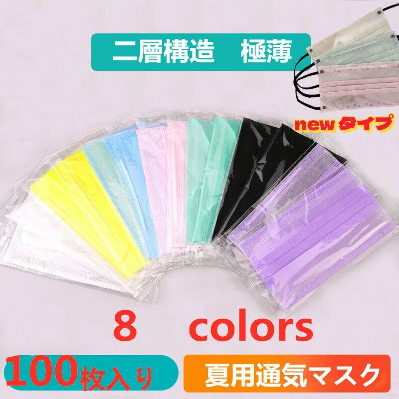 【2点購入で400円OFF】【2層構造で気苦しくない】100枚入り マスク 不織布 通気性よく 夏用マスク 極薄成人用 通気性よく 使い捨てマスク 多色 不織布2層式 ラベンダー ピンク 清潔 個別包装 不織布マスク カラー きれい ピンク イエロー