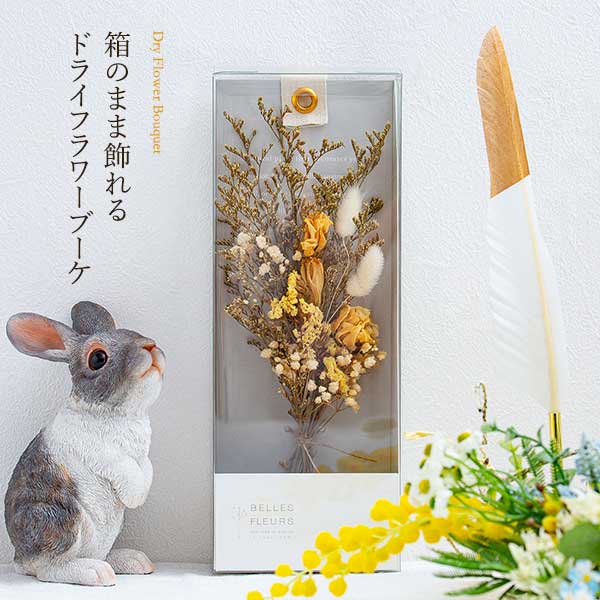 商品情報 【商品内容】 箱のまま飾れるドライフラワーブーケ ナチュラルなデザインのディスプレイボックスに入った壁掛けできる可憐なドライフラワーブーケ。 【知っておいてほしいこと】 ■ドライフラワーは植物ですので、花色・形・開花状況は写真とは多少異なる場合がございます。 フラワーデザイナーが一つひとつ商品をお作りさせていただいておりますので、花のサイズや大きさなど天然の素材に対して、適した配置でお作りいたしますので、写真とは若干花の位置などが違う場合がございます。 ■ドライフラワーは花を乾燥させた物になりますので、配送中に若干小花や小さな枝が振動等でケース内に少し落ちる場合がございます。 商品が著しく破損している以外は、天然のものになりますので交換の対象になりません点、ご了承ください。 【付属品】 ・ドライフラワー取扱説明書 ・メッセージカード付けられます (※ご希望の場合は、備考欄に希望するを付けメッセージをご入力ください) 配送について 【お届け期間について】 1~3日以内に発送予定(お急ぎの場合はご連絡ください。) 【安心補償】 商品到着後、植物に損傷があった場合は、すぐにご連絡ください。同等品のドライフラワーを再送いたします。 【送料について】 沖縄・離島・その他一部地域につきましては、お届けしておりません。ご注文いただきましても、キャンセルとさせて頂きます。
