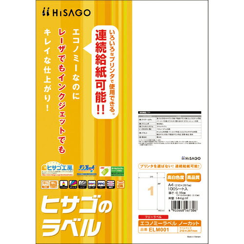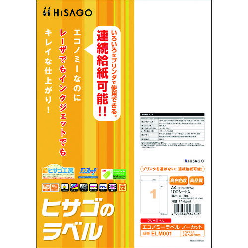 >商品名:HISAGO エコノミーラベル ノーカットHISAGO コードNo: ELM001オレンジブック発注コード:214-7613JANコード: 4902668567306>●各種プリンタ(レーザ・インクジェット・コピー機)でマルチに印刷可能で、カラーレーザプリンタ、カラーコピー機にも対応しています。●剥離紙(台紙)は樹脂ラミネート加工をしていませんので、そのまま雑誌古紙としてリサイクルできます。●連続給紙が可能なので、大量に印刷したい場合にも便利です。●フリーサイズにカットできるノーカットタイプです。●台紙から剥がしやすいように、裏面の剥離紙には、あらかじめスリット(切れ込み)が2本入っています。>->●色:白●面付:1●ラベルサイズ(mm)縦:297●ラベルサイズ(mm)横:210●紙厚さ(mm):0.15●ラベルのみの厚さ(mm):0.10●坪量(g/[[M2]]):144>●用紙サイズ(mm):A4(210×297)>●上質紙 (※剥離紙はリサイクル可能)>->●レーザプリンタ・コピー機によっては(特に「厚紙」設定がない機種では)トナーが定着しにくい場合があります。●塗りつぶし面積が大きい場合、ムラが出ることがあります。