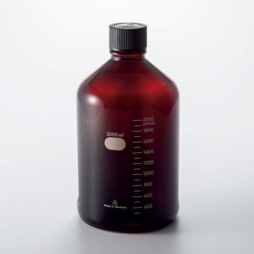 ガラスボトルは耐熱性、耐薬品性に優れた硬質1級ガラス製。 ガラスボトル本体、キャップ、パッキンともにオートクレーブ及び乾熱滅菌に対応。 パッキン接液面はPTFEで耐薬品性に優れています。 キャップとパッキンは接着しています。 注ぎ時の液切れ良好。液切れリング不要です。 茶瓶は外側のみ茶染めしているため、硬質2級ガラス製の茶瓶に比べ、耐熱性に優れ溶出物も少ないです。 容量(ml):2000 外径×高さ(mm):141×250(高さはキャップを除く) 口内径(mm):31.5 ねじ規格:45 キャップ材質:フェノール パッキン:シリコン/PTFEライナー 耐熱温度:MAX180℃