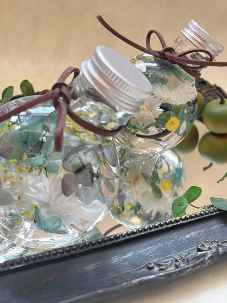プリザーブドフラワーやドライフラワーをハーバリウムオイルに浸したアレンジです。 傾きがお洒落なハーバリウムです。コスパも良く、ちょっとしたギフトにおすすめです。 ピンクのヘリクリサムのハーバリウムは、こちらから ロココ調ハーバリウムは、こちらから ミラーコースターは、こちらから 素材:プリザーブドフラワー(ヘリクリサム アジサイ かすみ草) ハーバリウムオイル サイズ:7×4.5 高さ9.5センチ ※商品の性質上、掲載画像と全く同じ商品をご用意出来ません。ハンド メイドのため予めご了承下さい。 ※発送の関係上、沖縄・北海道へのお届けはお受けできません。ハーバリウムの新感覚のインテリア雑貨 浮遊感をお楽しみ下さい。 プリザーブドフラワーやドライフラワーをガラスのボトルに入れて専用のオイルに浸すことで、お手入れ不要、1年以上みずみずしく綺麗な状態を楽しめます。 ばらまきギフトミニサイズのハーバリウム ギフト対応