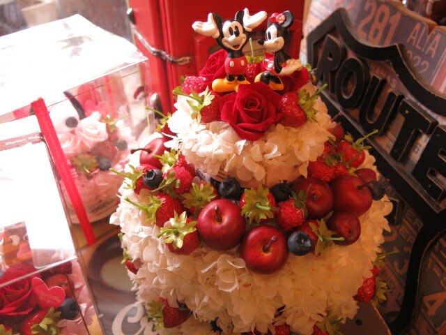 楽屋花 ディズニー フラワーギフト ケーキ ミッキー&ミニー フルーツいっぱいのケーキのプリザーブドフラワー ホワイト ケース付き ノーマル ミッキー ミニー◆誕生日プレゼント・記念日の贈り物におすすめのフラワーギフト