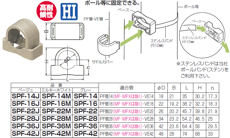 製品仕様型番・メーカー・商品名SPF-16J 未来工業 PF・VE兼用台付サドル(ベージュ)(50個入)商品説明●高耐候性・HI●PF管・VE管を壁面より浮かせて固定できます。●ステンレスバンドでポール等に固定できるバンド通し穴が設けてあります。●カバーとベースの分割式ですから、ベース先付けができます。●スペーサーを重ね合わせてPF・VE兼用台付サドルの高さが調節できます。注意:ポール等に取り付けるには、スペーサーは3段以上取り付けないで下さい。取り付けできない恐れがあります。●適合管:PF管16(1.5重管・2層管)、VE管16※色は写真と異なる場合があります。商品名中の色が正しい色です。