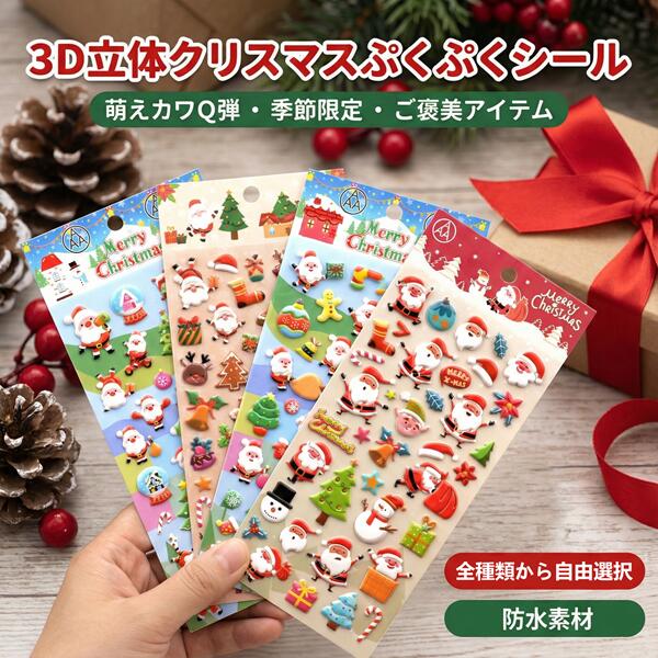 思わず触りたくなる!ぷくぷく可愛い3Dステッカー 貼るだけでクリスマス気分UP!手作りカードやラッピングに最適♪ お子様大喜び!クリスマスのご褒美シールにもおすすめです。 ◆ ぷくぷく立体感 スポンジが入った3D仕様で、触ると柔らかく、見た目も立体的で存在感抜群。 普通のシールとは違う「特別感」があります。 ◆ 豊富なバリエーション サンタさん、トナカイ、雪だるま、クリスマスツリーなど、 クリスマスに欠かせないキャラクターが勢揃い! シートごとにデザインが異なるので、選ぶ楽しさも満載です。 ◆ 多用途に使える クリスマスカードのデコレーション、手帳や日記のアクセント、スマホケース、小物のアレンジに。 また、お子様のトイレトレーニングやお手伝いのご褒美シールとしても大活躍します。 ◆ 製品仕様 サイズ:約22cm × 10cm(1シートあたり) 素材:防水性のあるPVC素材 耐久性があり、安心してお使いいただけます。思わず触りたくなる ぷくぷく可愛い3Dステッカー 貼るだけでクリスマス気分が上がります。手作りカードやラッピングに最適です。 お子様にも喜ばれるクリスマスのご褒美シールとしてお使いいただけます。 ぷくぷく立体感 スポンジが入った3D仕様で、触ると柔らかく、見た目も立体的で存在感があります。 普通のシールとは違う特別感があります。 豊富なバリエーション サンタ、トナカイ、雪だるま、クリスマスツリーなど、クリスマスに合うキャラクターがそろっています。 シートごとにデザインが異なるため、選ぶ楽しさがあります。 多用途に使える クリスマスカードの飾り付け、手帳や日記、スマホケース、小物のアレンジに使えます。 お子様のトイレトレーニングやお手伝いのご褒美シールとしても活躍します。 製品仕様 サイズ 約22cm × 10cm 1シートあたり 素材 PVC 防水性あり 耐久性があり安心して使用できます。