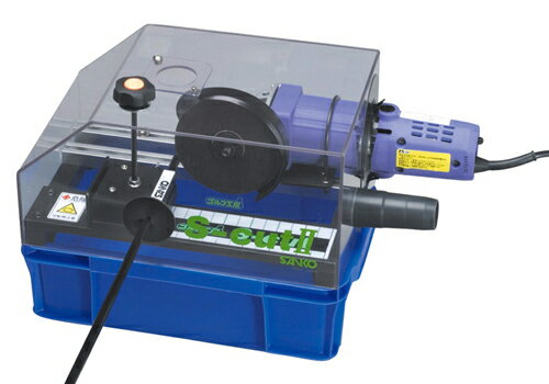 集塵パイプ、飛散防止ケース付きシャフト切断機 シャフトを素早く、確実・安全にカットできるSカットがバージョンアップ。ホコリを飛散しない防塵カバーと、ホコリを受け止める水槽が新たに追加。2本同時に切れる構造と6インチのスケール付き。 ●カーボン・スチールシャフト兼用 ●300×185×145mm ●AC100V ●約6kg ●最高使用周速度:80m/s(4800m/min)
